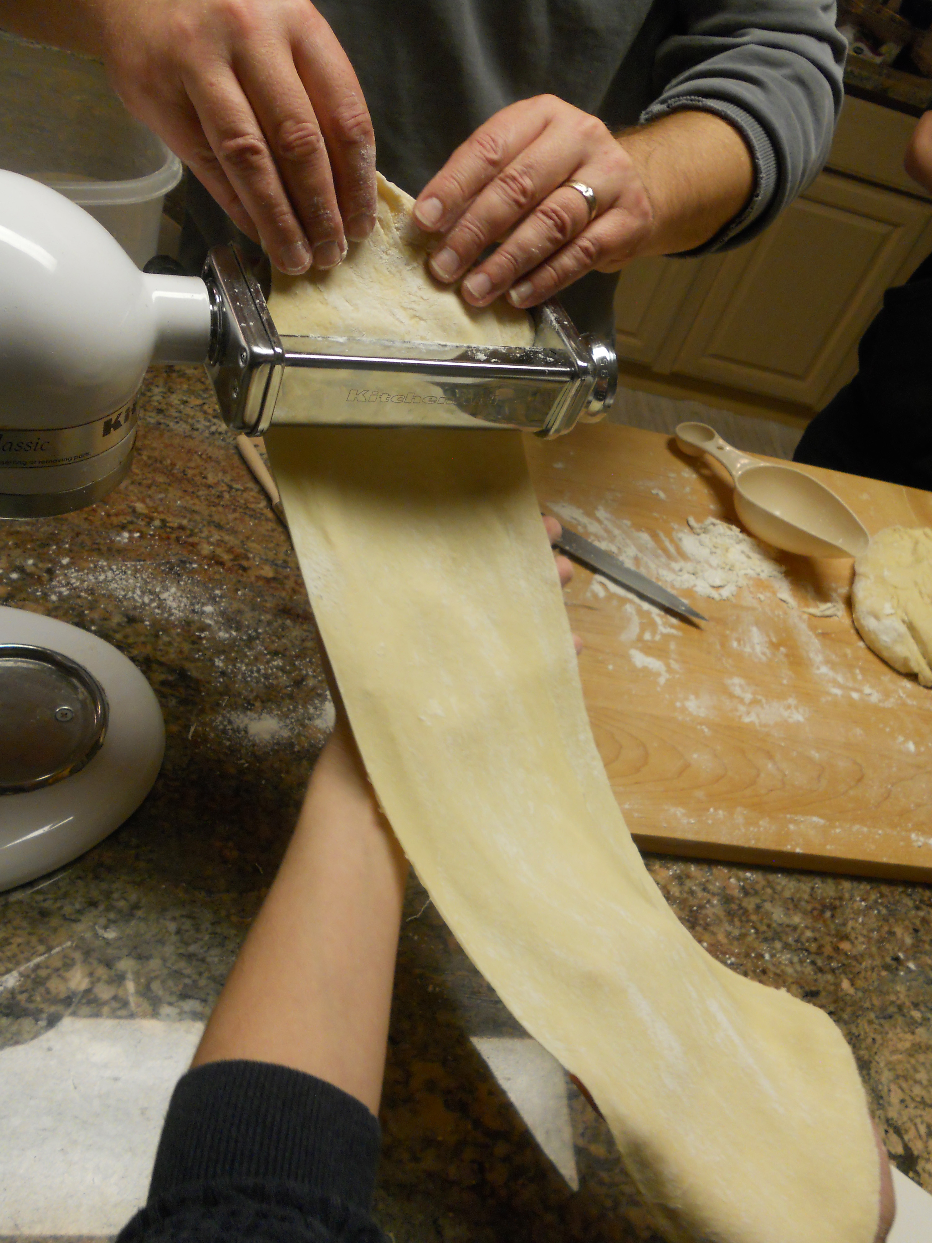 DSCN0564 Published December 16, 2012 at 3000 × 4000 in An Italian Christmas Dinner -Meat & Cheese Raviolis Run balls of dough through the machine, creating strips of flattened dough.