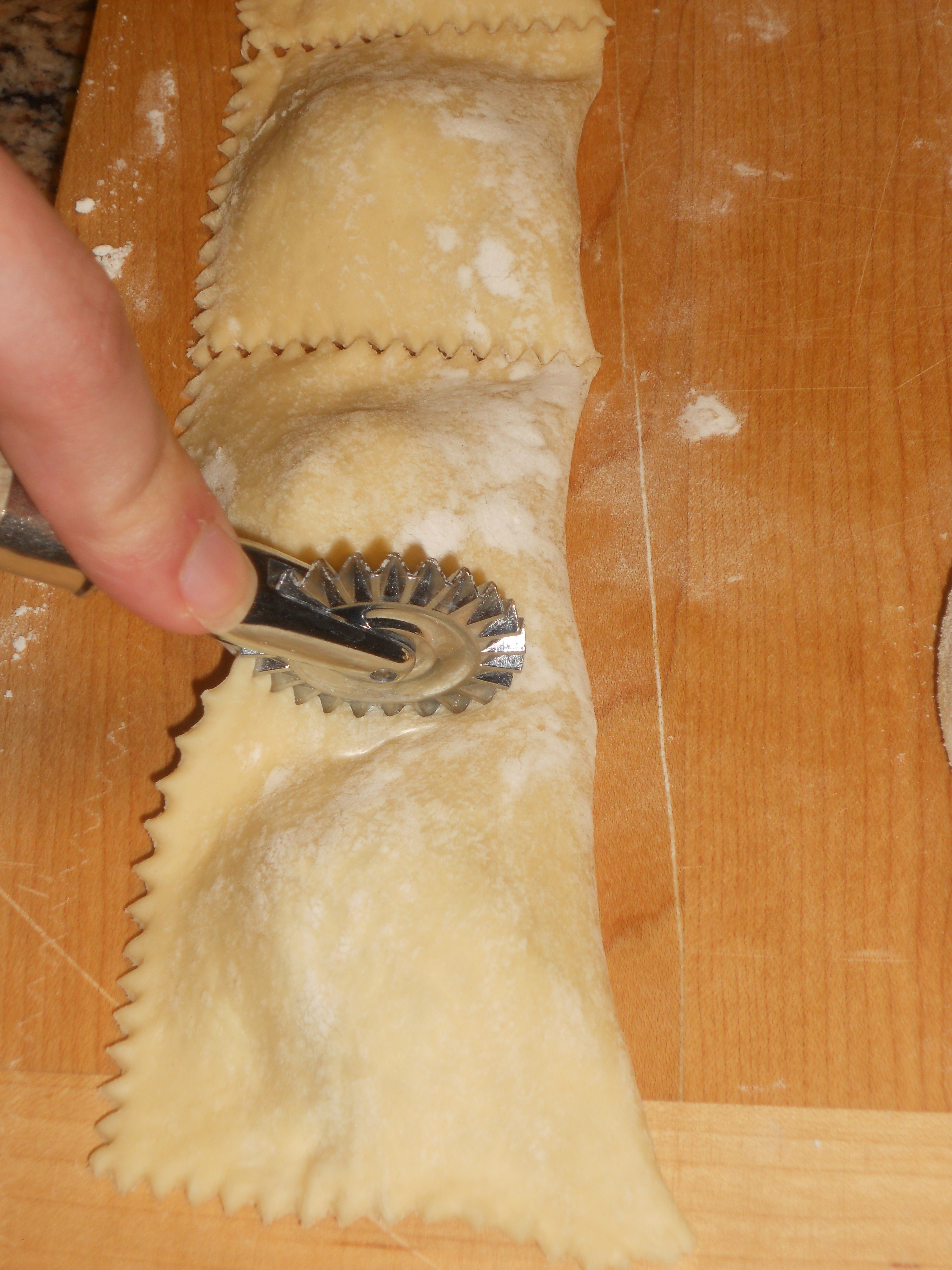 DSCN0573 Published December 16, 2012 at 3000 × 4000 in An Italian Christmas Dinner -Meat & Cheese Raviolis “Pillows” get cut apart with the ravioli wheel.