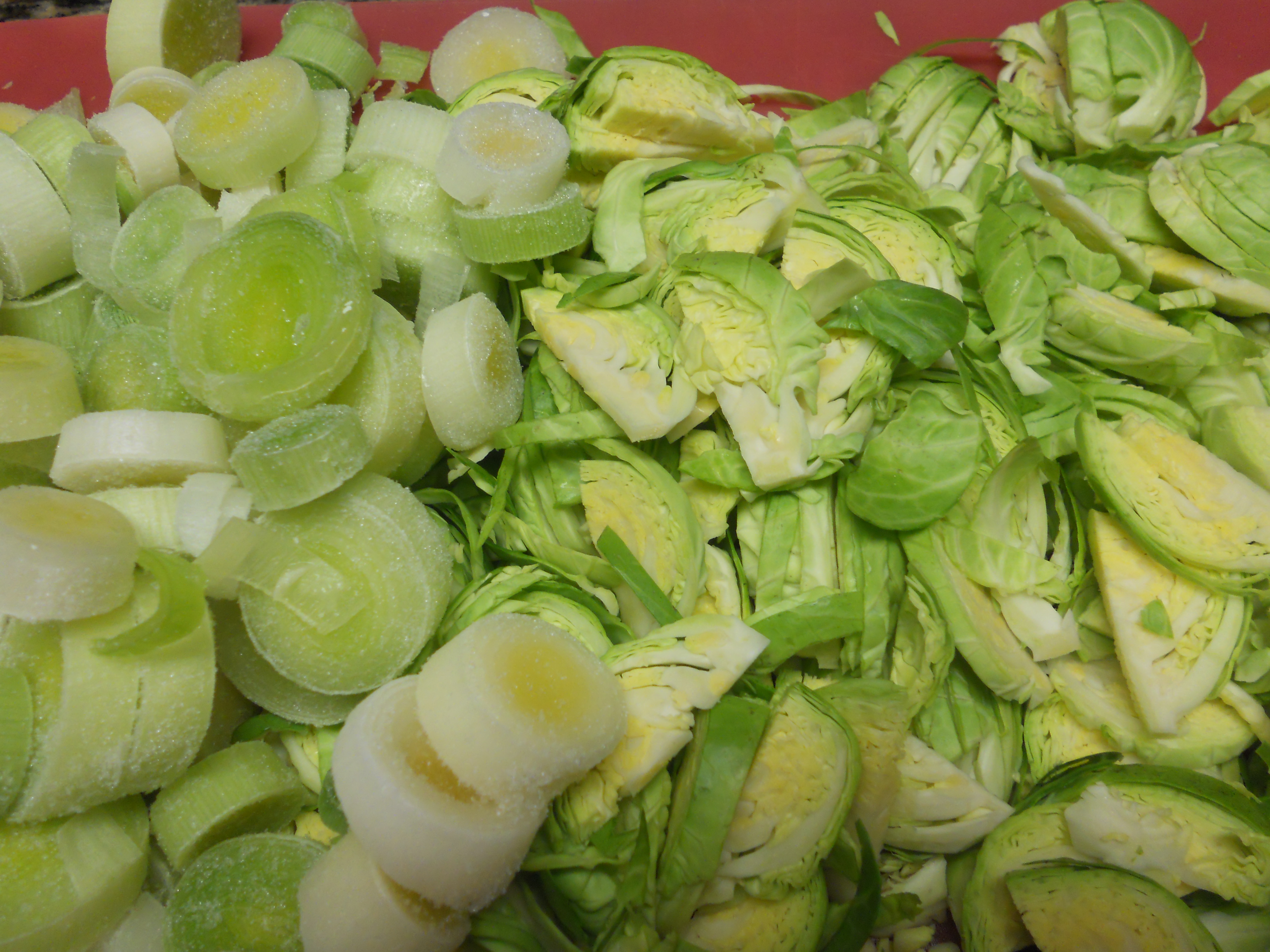 DSCN1375 Published January 11, 2013 at 4000 × 3000 in Soups On! Brussel Sprout Soup and Caraway Rye Bread Slice the Brussel sprouts & leeks.