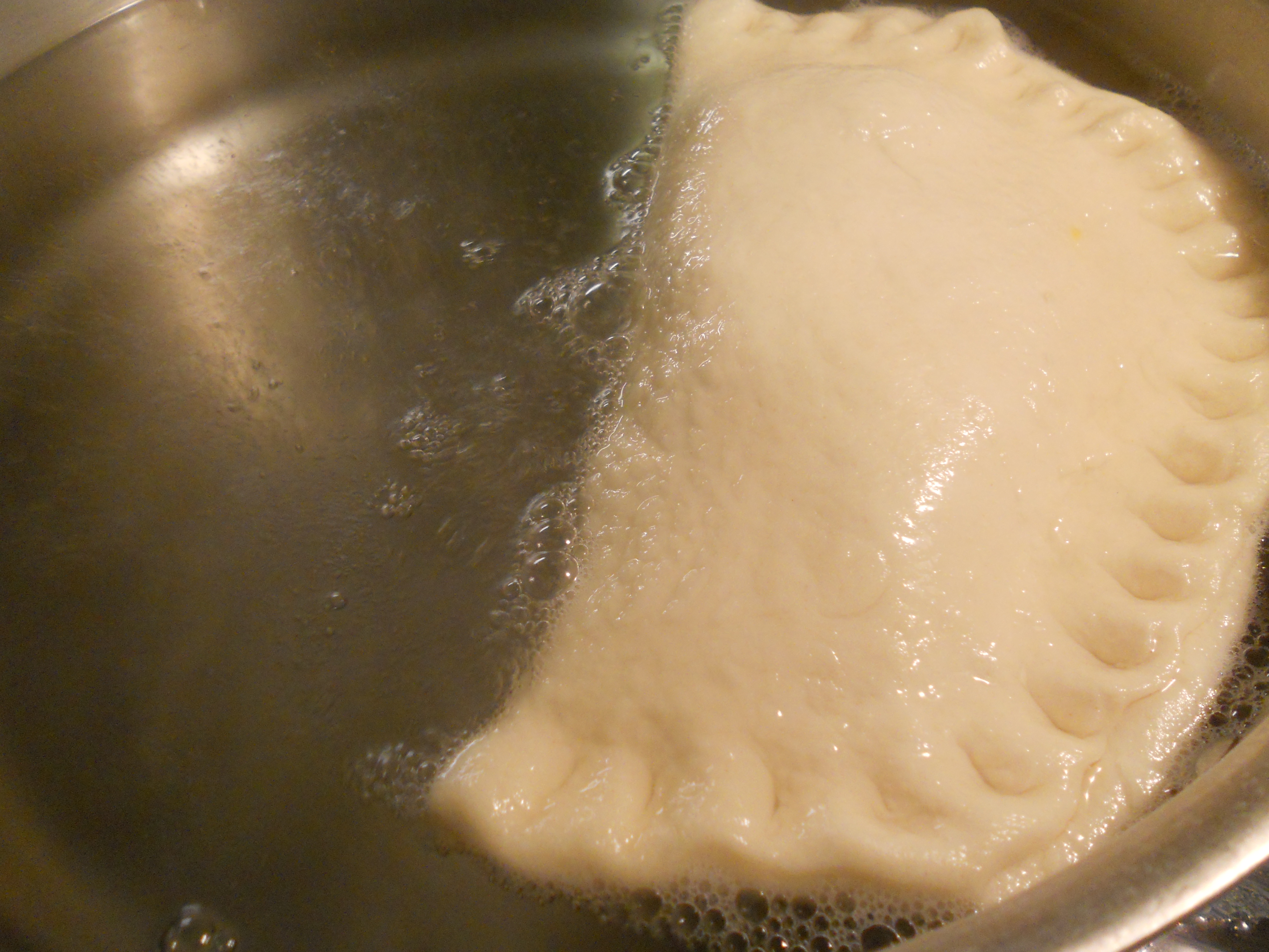 DSCN1633 Published February 21, 2013 at 4000 × 3000 in A Twist on a Calzone – Stuffed Pretzel Calzones Into the water bath for 30 seconds they go!