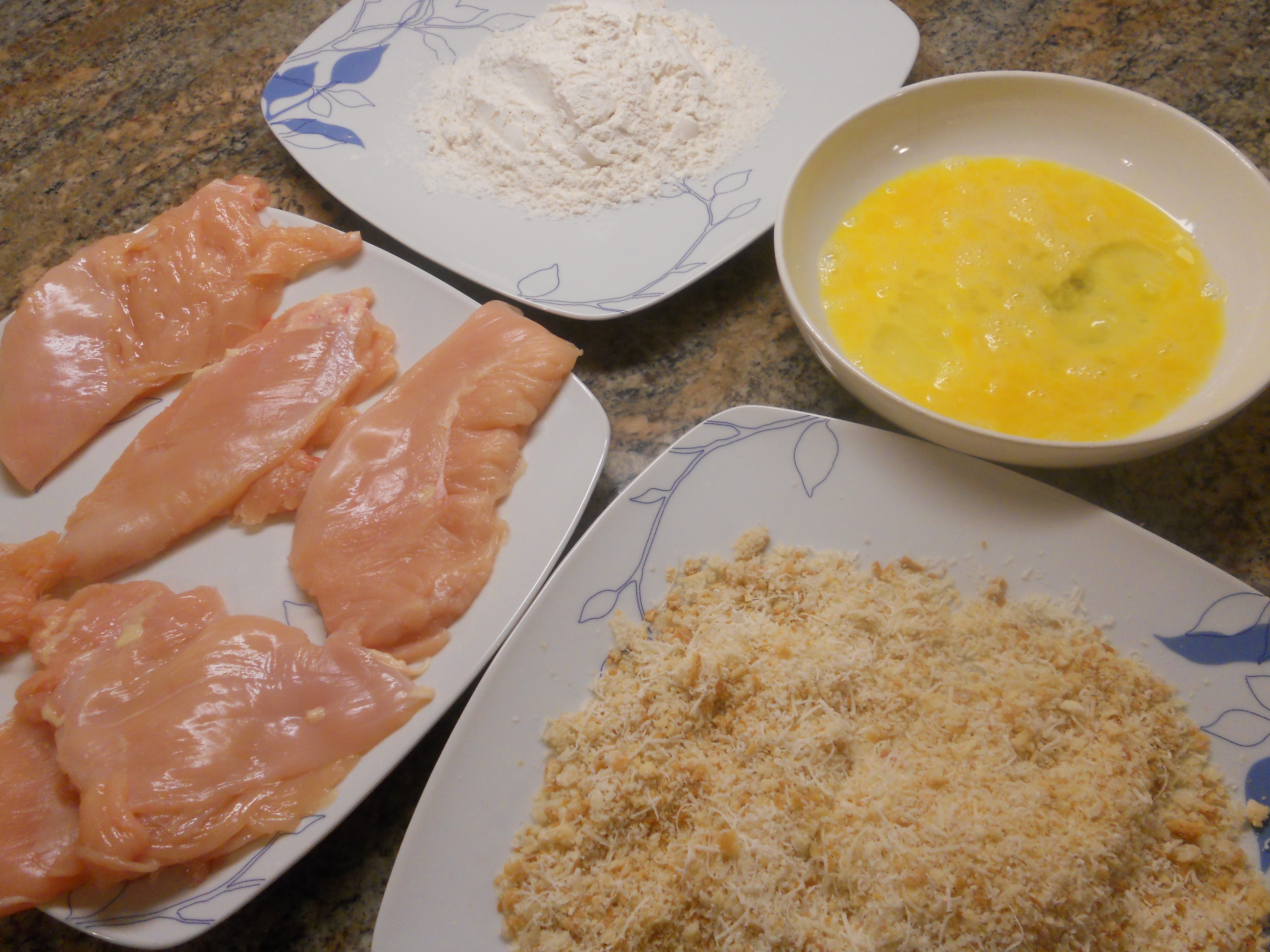 DSCN2216 Published February 28, 2013 at 4000 × 3000 in Cooking with Andrew – Chicken Milanese with Salad and Pickled Red Onions Set up a production line for coating the chicken.